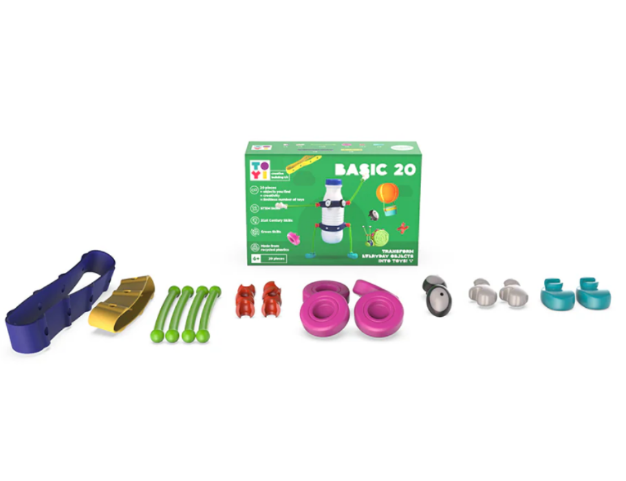 Verwandle Alltagsgegenstände in einzigartiges Spielzeug mit dem Basis 20 Bauset von Toyi!