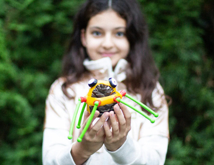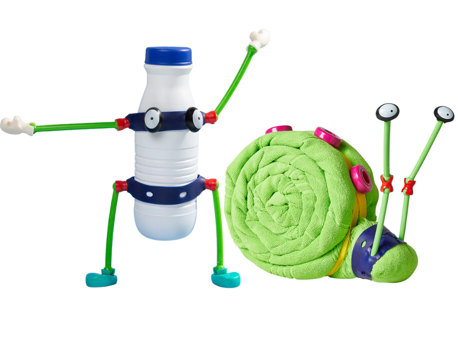 Mit diesem Kreativset aus 20 Bauteilen können Kinder ihr eigenes Spielzeug aus ganz gewöhnlichen Dingen herstellen. Einfach die Bauteile mit Gegenständen aus dem Haushalt kombinieren – und schon entstehen verrückte Wesen oder futuristische Gadgets.