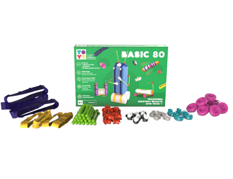Verwandle Alltagsgegenstände in einzigartiges Spielzeug mit dem Basis 80 Bauset von Toyi!