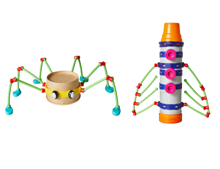 Mit diesem Kreativset aus 80 Bauteilen können Kinder ihr eigenes Spielzeug aus ganz gewöhnlichen Dingen herstellen. Einfach die Bauteile mit Gegenständen aus dem Haushalt kombinieren – und schon entstehen verrückte Wesen oder futuristische Gadgets.
