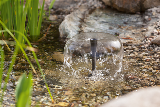 Der elektronische Antrieb sorgt für Langlebigkeit und Zuverlässigkeit. Der Wasserdurchfluss ist über einen Drehregler einstellbar. Die Pumpe lässt sich leicht zur Reinigung zerlegen. Zusätzlich kann ein Schlauch an der Oberseite angeschlossen werden, um kleinere Wasserspeier oder Brunnen zu betreiben. Geeignet für Süßwassser.